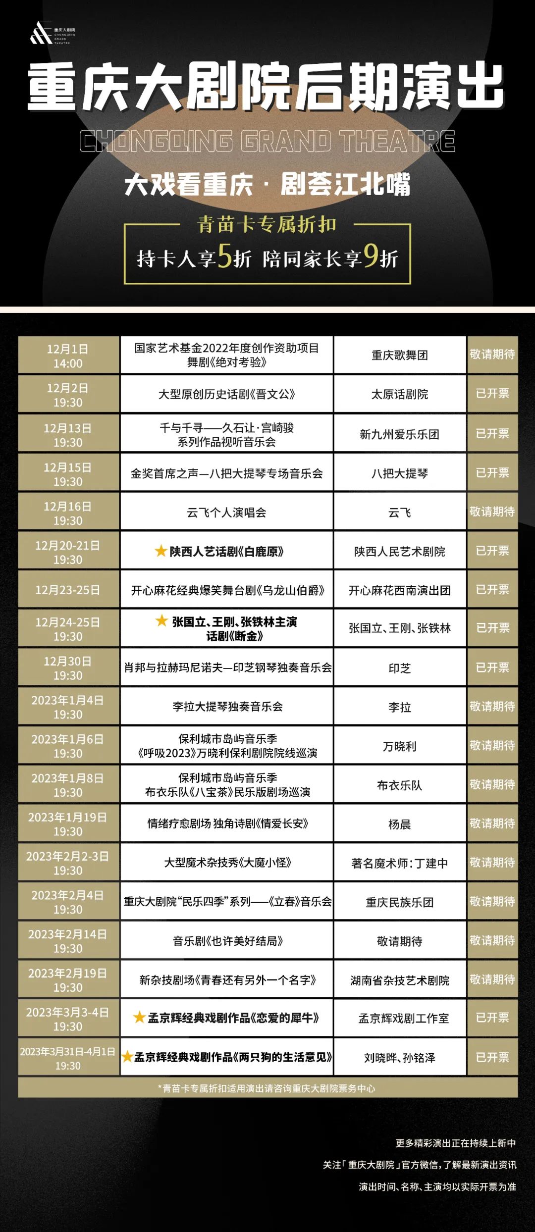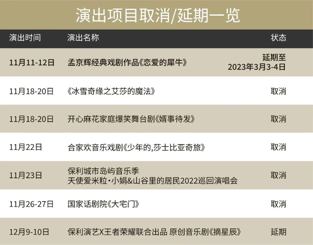 面对反复无常的疫情,剧院坚持常态防控及安全生产工作,并积极筹备2022-2023全年品质大戏。张国立&王刚&张铁林主演话剧《断金》、音乐剧《也许美好结局》、孟京辉经典戏剧作品《两只狗的生活意见》《恋爱的犀牛》等部分取消演出已经定档回归,我们期待与您一同奔赴美好艺术生活。