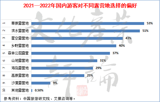 此外,行业监测表明,近年来国内露营市场持续升温,不同层次的游客在选择营地环境和功能时有着各自的偏好。监测数据显示,2021至2022年,超过一半的国内露营游客更倾向于选择草地型和湖畔型露营营地,而仅有大约9%的露营者偏爱沙漠型露营营地。平均而言,每位露营者体验过2至3个不同类型的露营营地。而年轻群体更倾向选择多元素融合露营营地。