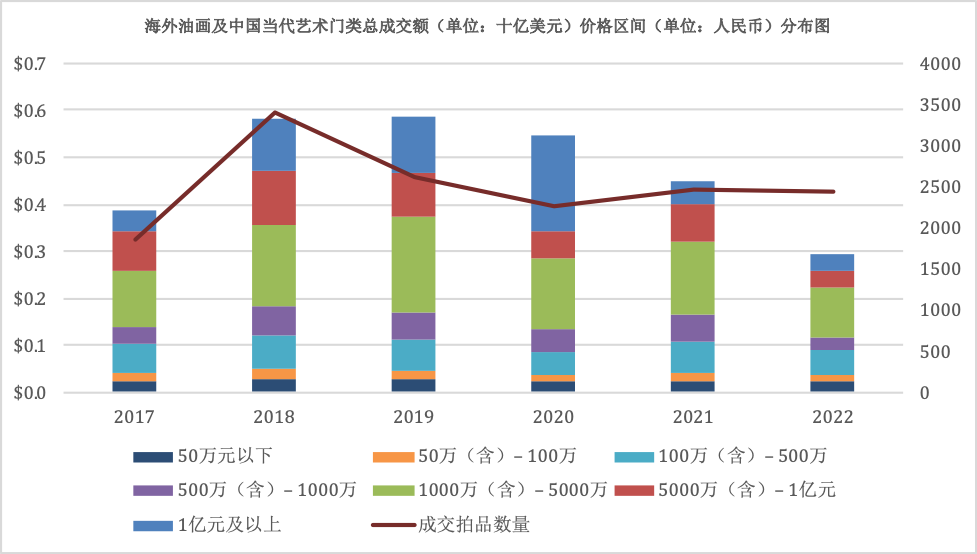 海外油画及中国当代艺术门类总成交额(单位:十亿美元)价格区间分布图
