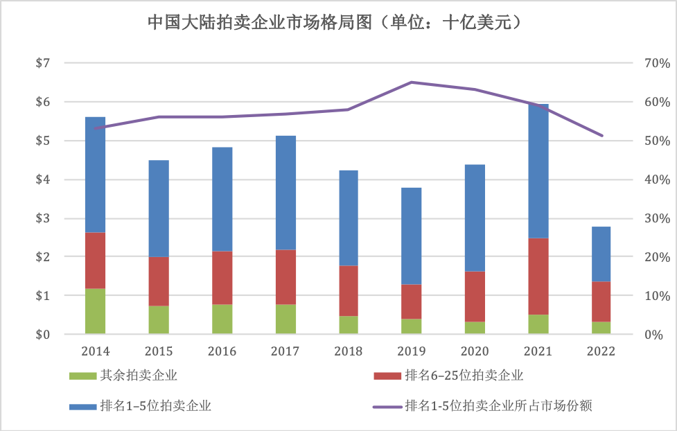 中国内地拍卖企业市场格局图(单位:十亿美元)