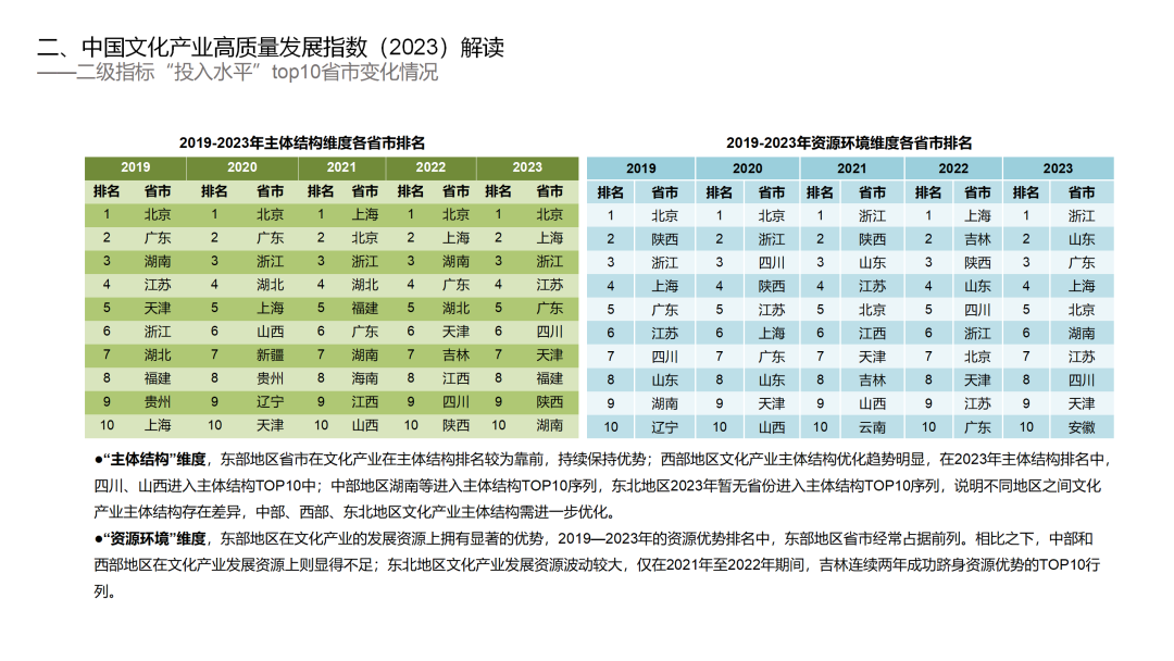 “主体结构”维度,东部地区省市在文化产业在主体结构排名较为靠前,持续保持优势;西部地区文化产业主体结构优化趋势明显,在2023年主体结构排名中,四川、山西进入主体结构TOP10中;中部地区湖南等进入主体结构TOP10序列,东北地区2023年暂无省份进入主体结构TOP10序列,说明不同地区之间文化产业主体结构存在差异,中部、西部、东北地区文化产业主体结构需进一步优化。