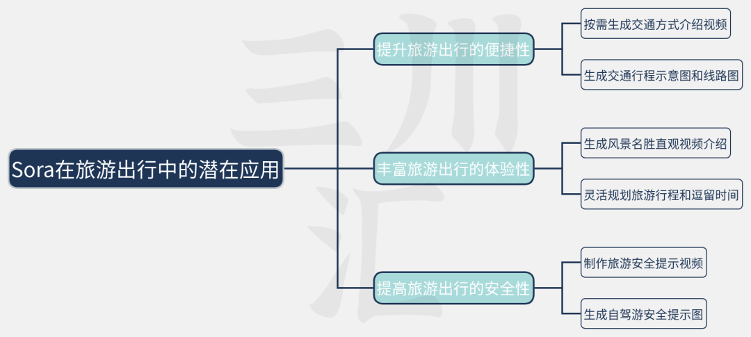 一是提升旅游出行的便捷性。Sora的视频生成功能可以按照用户出行需求(文字指令),为游客提供各类交通方式的介绍视频,如铁路、道路、水上和空中运输工具等,帮助游客更好地了解和选择适合自己的交通方式。同时,图片生成功能还可以生成各类交通行程示意图、线路图等信息,为游客提供直观的导航服务,提升出行的便捷性。