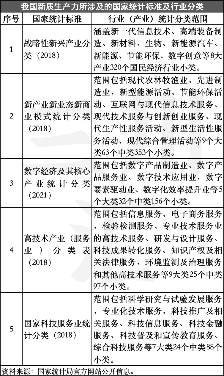 综上分类梳理,尽管目前关于新质生产力及相关核心产业分类标准尚未健全,但从新质生产力内在逻辑关系中不难发现,在我国现行的产业分类体系中,战略性新兴产业、“三新”经济模式、数字经济及其核心产业、高技术产业(服务业)和科技服务业等五大产业,既是新质生产力重要的产业“底座”,也是新质生产力未来发展的重要方向和基本框架。