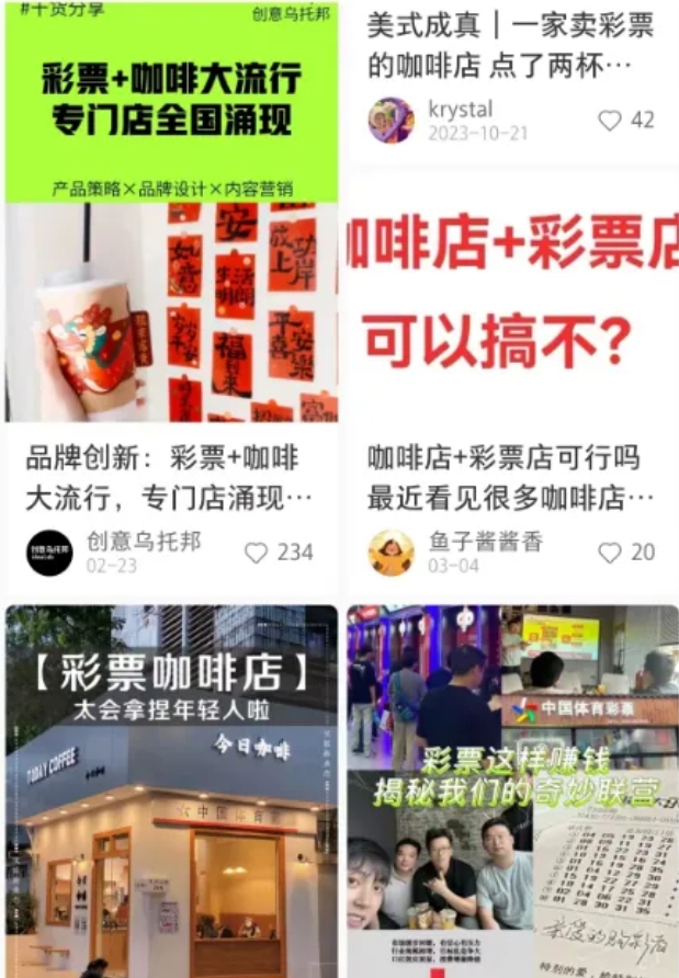 惊蛰研究所观察到,在小红书平台上,搜索“彩票、咖啡店”等关键词,除了打卡探店的笔记,还有不少探讨网红彩咖店商业模式、创业手法的内容,开一家“彩咖店”已经成为年轻创业者实现“躺赚梦”的新热点。