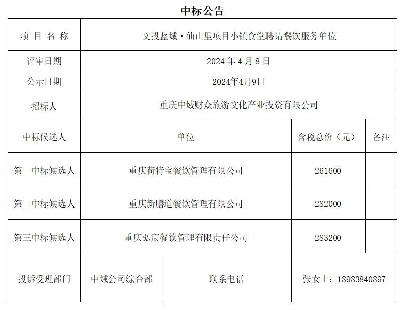 文投蓝城·仙山里项目小镇食堂聘请餐饮服务单位中标公告